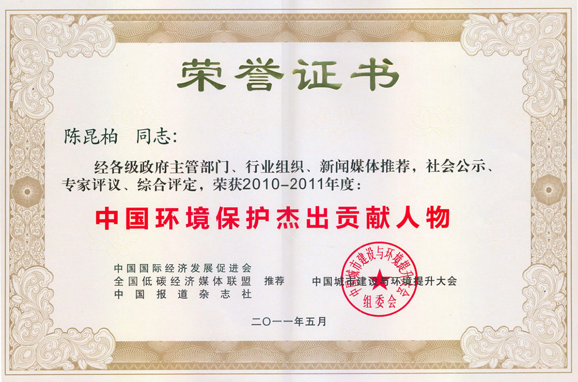 經(jīng)各級(jí)政府主管部門(mén)、行業(yè)組織、新聞媒體推薦,社會(huì)公示、專家評(píng)議、綜合評(píng)定,陳昆柏同志榮獲2010-2011年度“中國(guó)環(huán)境保護(hù)杰出貢獻(xiàn)人物”
