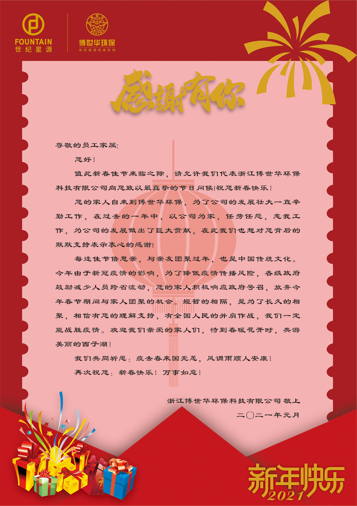 送“祝?!保翰┦廊A環保通過慰問信、微信拜年等方式,向在杭、在項目過年的員工及家屬致以親切慰問,提供更為細致周到的人文關懷。