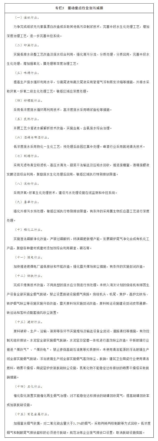 推動治污減排工程建設。各省(區、市)要制定實施造紙、印染等十大重點涉水行業專項治理方案,大幅降低污染物排放強度。電力、鋼鐵、紡織、造紙、石油石化、化工、食品發酵等高耗水行業達到先進定額標準。以燃煤電廠超低排放改造為重點,對電力、鋼鐵、建材、石化、有色金屬等重點行業,實施綜合治理,對二氧化硫、氮氧化物、煙粉塵以及重金屬等多污染物實施協同控制。各省(區、市)應于2017年底前制定專項治理方案并向社會公開,對治理不到位的工程項目要公開曝光。制定分行業治污技術政策,培育示范企業和示范工程。
