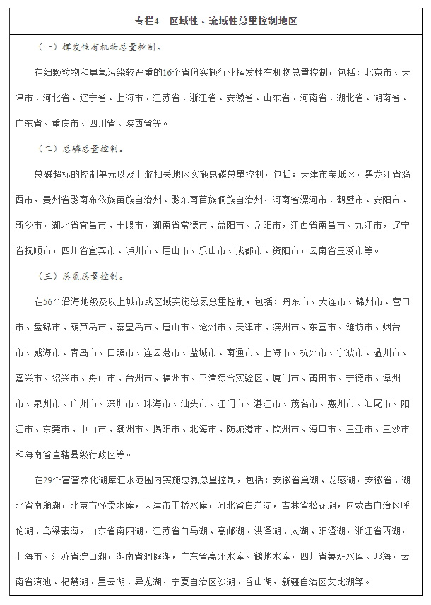 控制重點地區重點行業揮發性有機物排放。全面加強石化、有機化工、表面涂裝、包裝印刷等重點行業揮發性有機物控制。細顆粒物和臭氧污染嚴重省份實施行業揮發性有機污染物總量控制,制定揮發性有機污染物總量控制目標和實施方案。強化揮發性有機物與氮氧化物的協同減排,建立固定源、移動源、面源排放清單,對芳香烴、烯烴、炔烴、醛類、酮類等揮發性有機物實施重點減排。開展石化行業“泄漏檢測與修復”專項行動,對無組織排放開展治理。各地要明確時限,完成加油站、儲油庫、油罐車油氣回收治理,油氣回收率提高到90%以上,并加快推進原油成品油碼頭油氣回收治理。涂裝行業實施低揮發性有機物含量涂料替代、涂裝工藝與設備改進,建設揮發性有機物收集與治理設施。印刷行業全面開展低揮發性有機物含量原輔料替代,改進生產工藝。京津冀及周邊地區、長三角地區、珠三角地區,以及成渝、武漢及其周邊、遼寧中部、陜西關中、長株潭等城市群全面加強揮發性有機物排放控制。