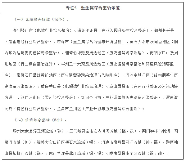 深化重點區域分類防控。重金屬污染防控重點區域制定實施重金屬污染綜合防治規劃,有效防控環境風險和改善區域環境質量,分區指導、一區一策,實施差別化防控管理,加快湘江等流域、區域突出問題綜合整治,“十三五”期間,爭取20個左右地區退出重點區域。在江蘇靖江市、浙江平陽縣等16個重點區域和江西大余縣浮江河流域等8個流域開展重金屬污染綜合整治示范,探索建立區域和流域重金屬污染治理與風險防控的技術和管理體系。建立“錳三角”(錳礦開采和生產過程中存在嚴重環境污染問題的重慶市秀山縣、湖南省花垣縣、貴州省松桃縣三個縣)綜合防控協調機制,統一制定綜合整治規劃。優化調整重點區域環境質量監測點位,2018年底前建成全國重金屬環境監測體系。