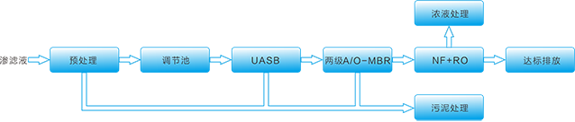 通過預處理去除滲濾液中大量的懸浮物及二價離子,然后進入UASB池。利用厭氧反應削減有機負荷,然后利用兩級A/O工藝的強化脫氮能力,保證總氮達標出水,同時進一步降低有機污染物濃度。A/O出水經超濾系統(UF)截留有機污泥,再通過膜深度處理系統(NF+RO),確保出水水質達標排放。